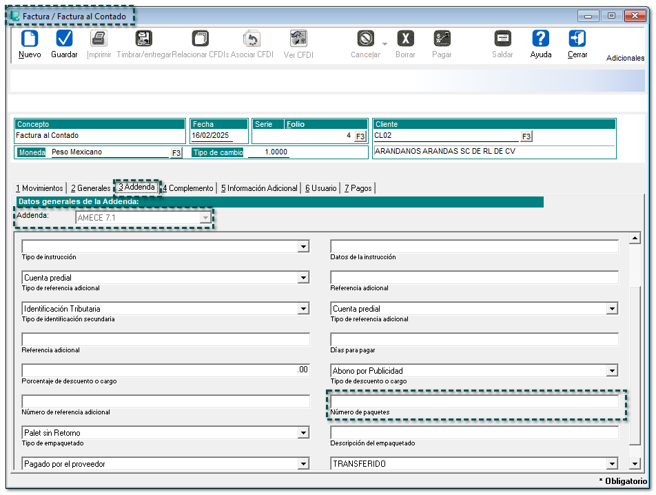 Folio D626039 A partir de esta versión, se modifica la Addenda AMECE 7.1 para que, el campo "Número de paquetes" sea de captura Opcional y no muestre información dentro del XML cuando no se tenga capturada información.
