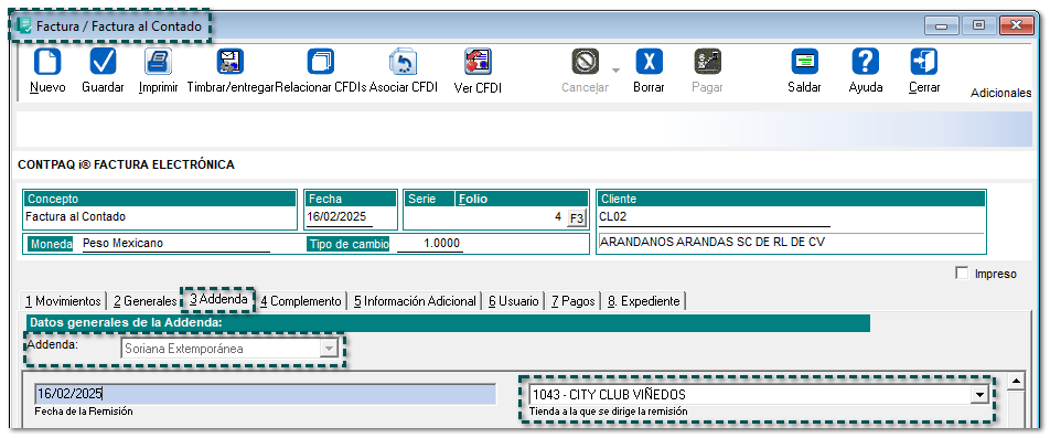 Folio D631213 Ahora, se agrega la sucursal: 1043 - CITY CLUB VIÑEDOS en el campo "Tienda a la que se dirige la remisión" a la Addenda Soriana Extemporánea a nivel Documento: