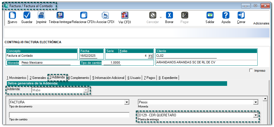 Folio D636460 A partir de ahora, se adiciona la sucursal: D129 - CDR QUERETARO en el campo "Planta de entrega" en la Addenda Mabe a nivel Documento: