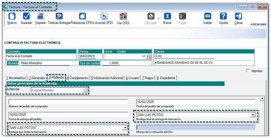 Folio D639827 A partir de esta versión, se agrega la Cedis: SAN LUIS POTOSÍ en los campos "Bodega que recibe la mercancía" y "Bodega final de entrega de mercancía" a nivel Documento en la Addenda Coppel Muebles.