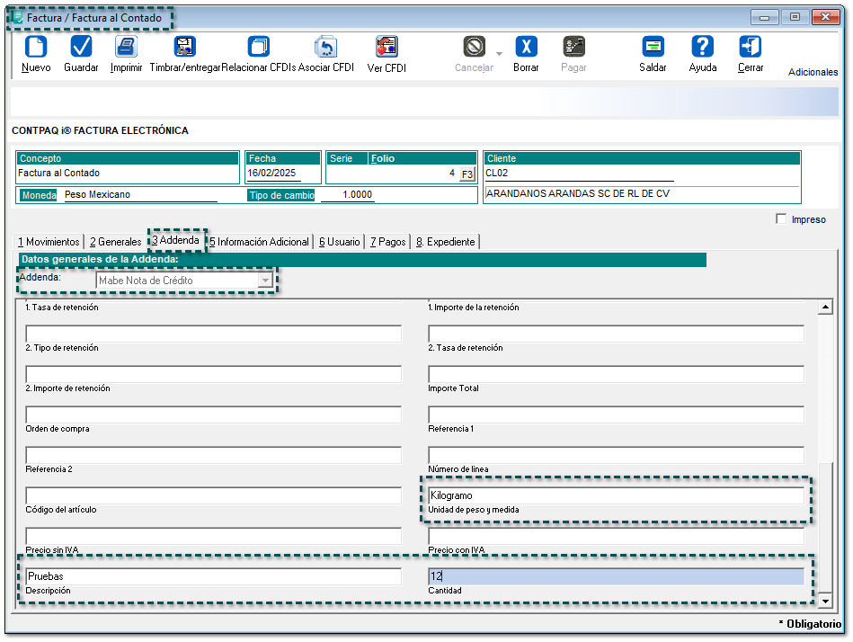 Ahora, se modifica la Addenda Mabe Nota de Crédito para que, en los campos "Descripción", "Unidad" y "Cantidad" se permitan capturar de forma manual la información a nivel documento, ya que, en versiones anteriores el sistema los generaba de manera automática, y al no incluir alguna descripción de un producto, aparecía la leyenda "Ninguno" en el XML.