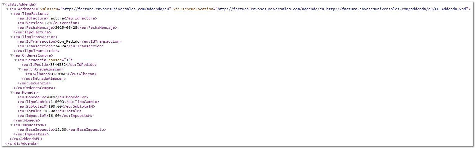 Folio D677623 A partir de esta versión, se modifica la estructura de la Addenda Envases Universales de México, quedando el XML de la siguiente manera: