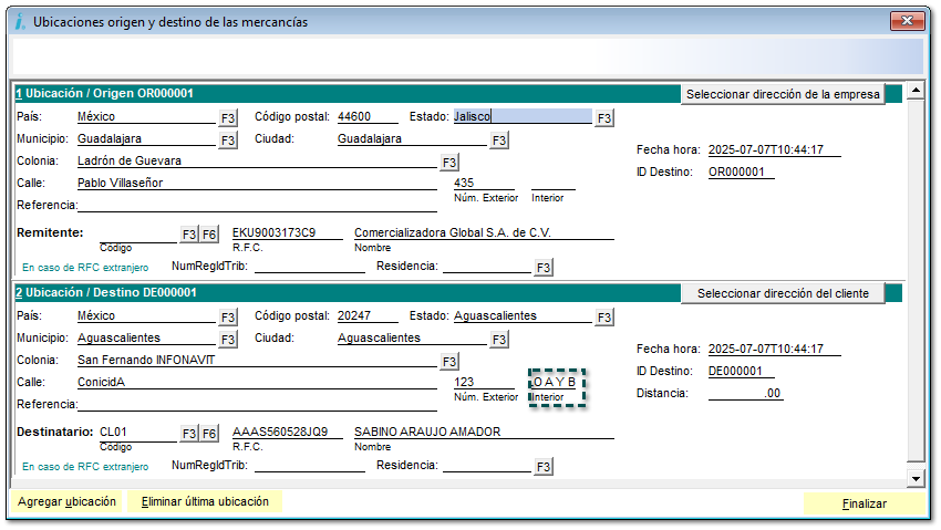 A partir de ahora, se mostrará correctamente la información que se capture en el campo "Número interior", para Ubicaciones origen / destino al momento de definirlas en el proceso de captura del complemento Carta Porte.