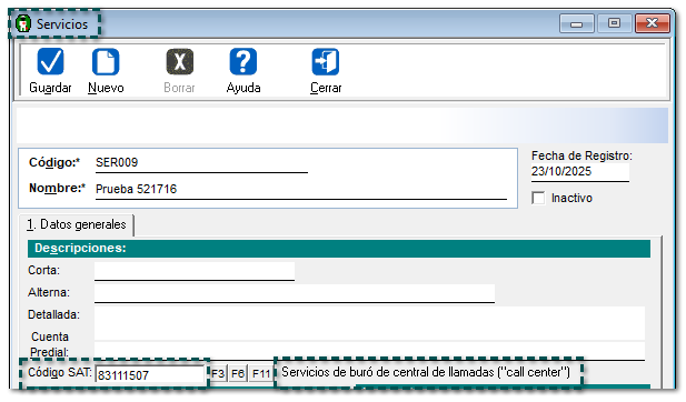 A partir de ahora, se mostrará el nombre de la etiqueta de manera correcta al seleccionar la Clave SAT: "83111507" en el catálogo de Servicios, ya que anteriormente, la leyenda de dicha etiqueta la mostraba incompleta.