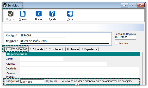 A partir de esta versión, aparecerá el nombre de la etiqueta correctamente al seleccionar la Clave SAT: "78111505" en el catálogo de Servicios, ya que anteriormente, la leyenda de dicha etiqueta la mostraba con otro nombre de código SAT.