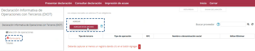 Al seleccionar la opción "La presenta con datos" y hacer clic en "Formulario", se cuenta con las siguientes dos modalidades para el registro de las 5 de secciones con los datos requeridos para la DIOT: