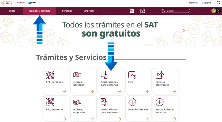 Haz clic en el menú "Trámites y servicios" y selecciona "Declaraciones para personas" o "Declaraciones para empresas", según te corresponda.