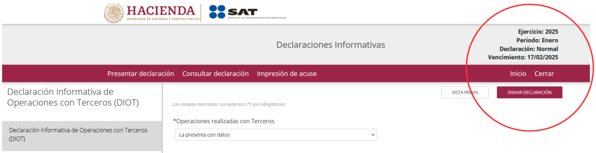 • Conforme a lo dispuesto en el artículo 4.5.1 de la Resolución Miscelánea Fiscal (RMF) 2025, la presentación de la DIOT debe efectuarse a más tardar el último día del mes siguiente al periodo en que se llevaron a cabo las operaciones. Esto implica que las operaciones realizadas durante enero de 2025, deben ser reportadas a más tardar el 28 de febrero de 2025.