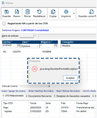 En la versión anterior del sistema, al hacer el desglose de IVA acreditable, presionando simultáneamente la combinación de teclas "CTRL" + "F4", en algunas pólizas de egresos con facturas cuyo importe era cero, se mostraba un mensaje de excepción similar al siguiente.