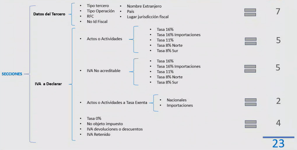 Ahora el número de campos disponibles para el llenado de la declaración es de 23, considerando los "Datos del tercero declarado" ya conocidos; así como el "IVA a Declarar por el tercero o proveedor", divido en el valor de los "Actos o actividades", que es donde registramos la base con la que se calculó el impuesto; aquí se incluyen las tasas utilizadas, ya sea16%, 16% Importaciones,11%, 8% Norte y 8% Sur, sin diferenciar si es tangible o intangible.