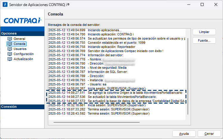 Los cambios en la base de datos podrás observarlos en la consola del Servidor de Aplicaciones de CONTPAQi®, al abrir por primera vez los sistemas de CONTPAQi Contabilidad® y CONTPAQi Bancos® en esta versión.