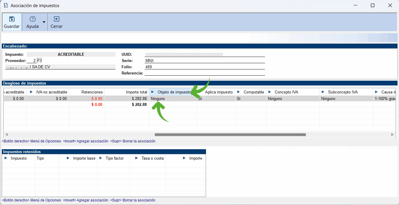 A partir de esta versión de CONTPAQi Contabilidad®, se han implementado mejoras clave para garantizar la estabilidad del sistema al modificar el valor de la columna "Objeto impuesto" en la ventana "Asociación de impuestos", especialmente durante el desglose del impuesto acreditable.