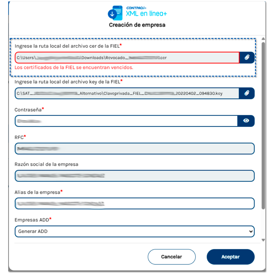 Durante el proceso de dar de alta una empresa en CONTPAQi XML en línea+®, el sistema valida que: