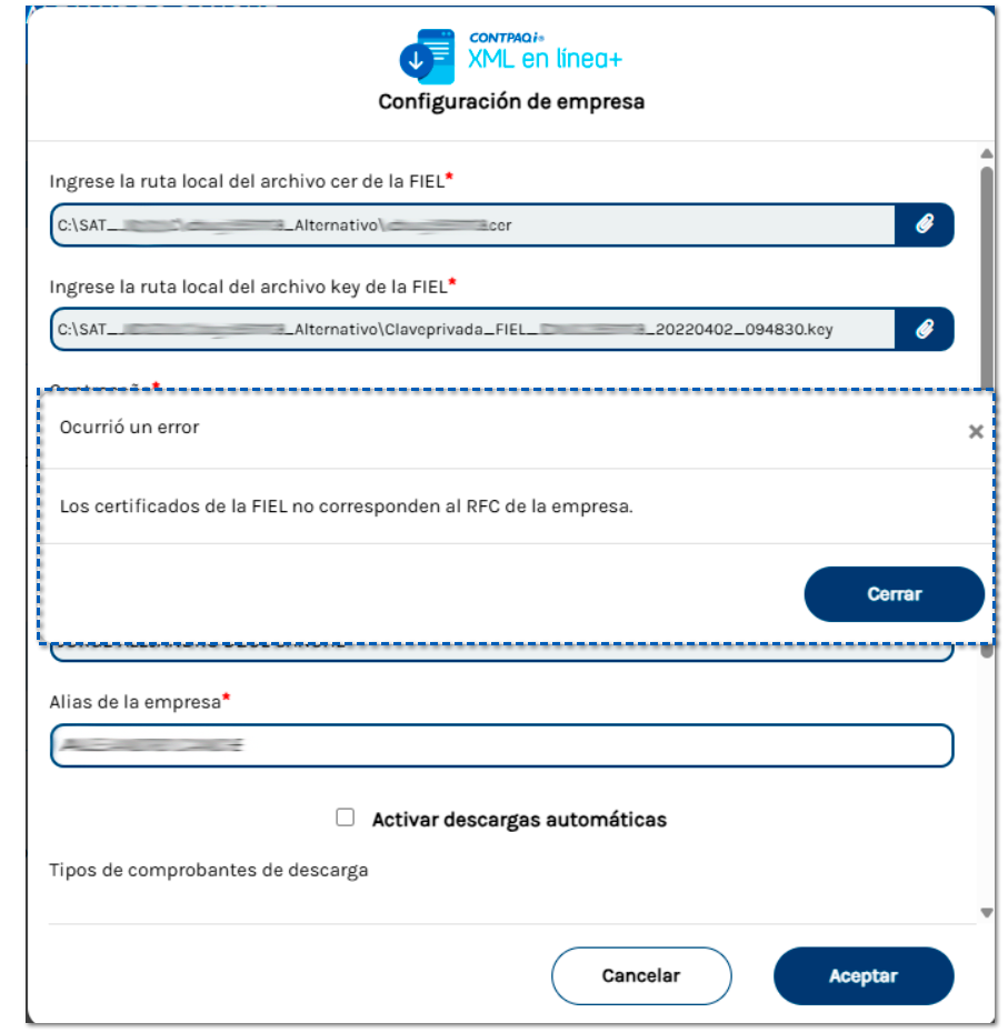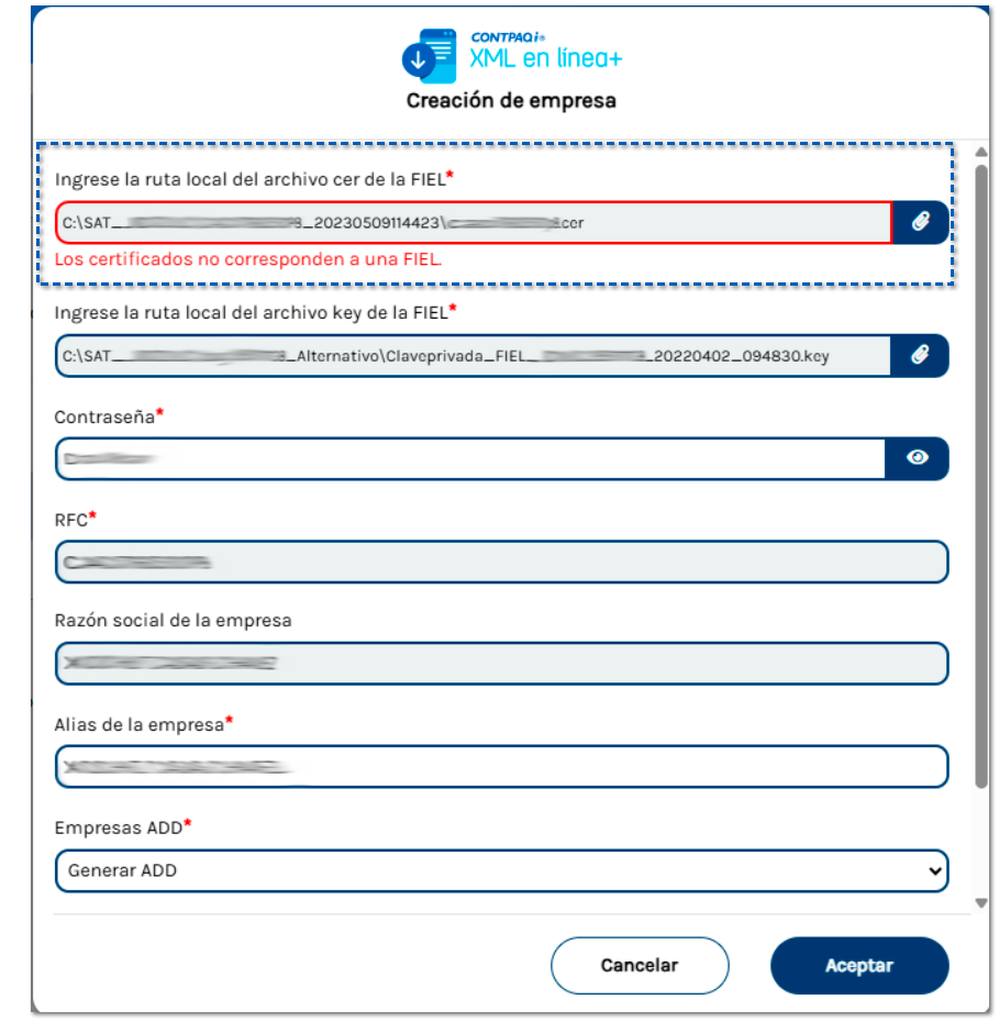 Los certificados de la FIEL no corresponden al RFC de la empresa: