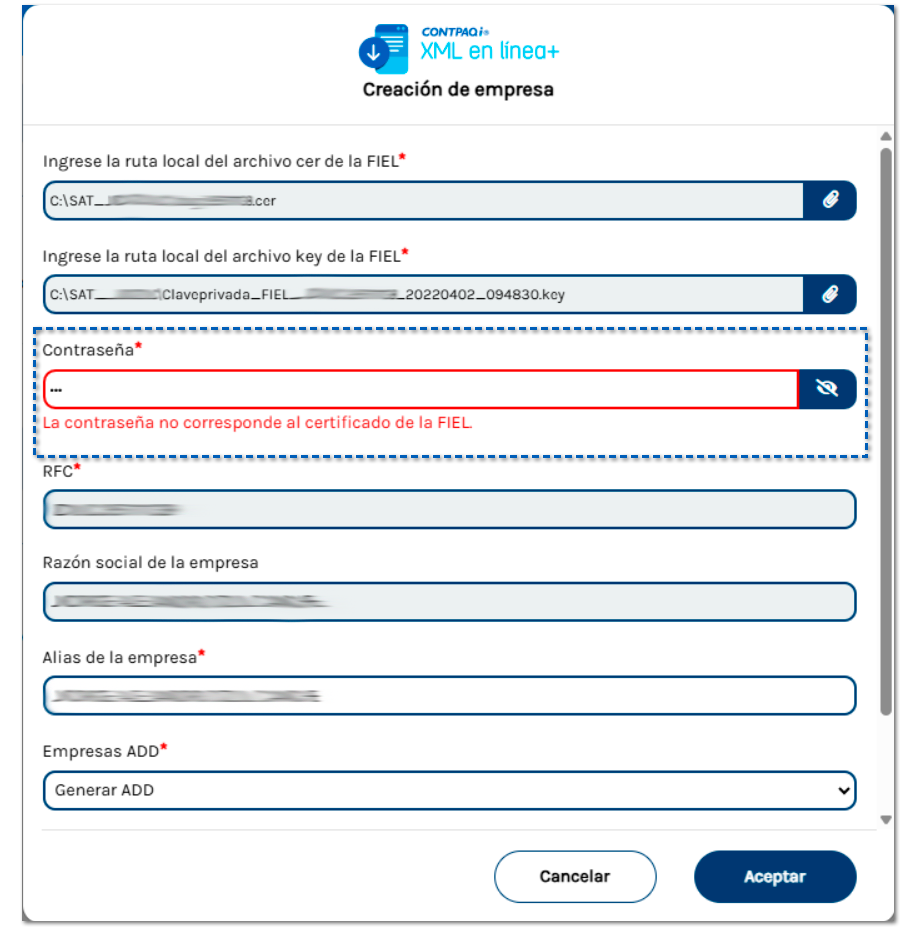 La contraseña capturada no corresponde al certificado FIEL ingresado previamente: