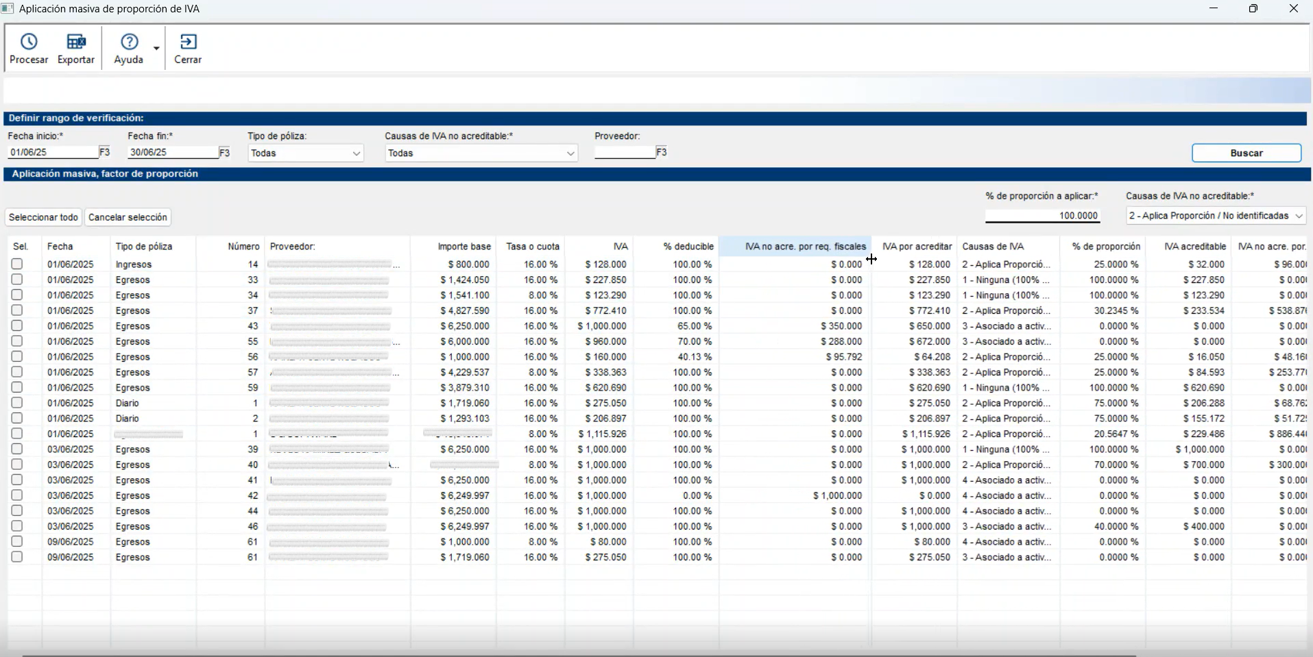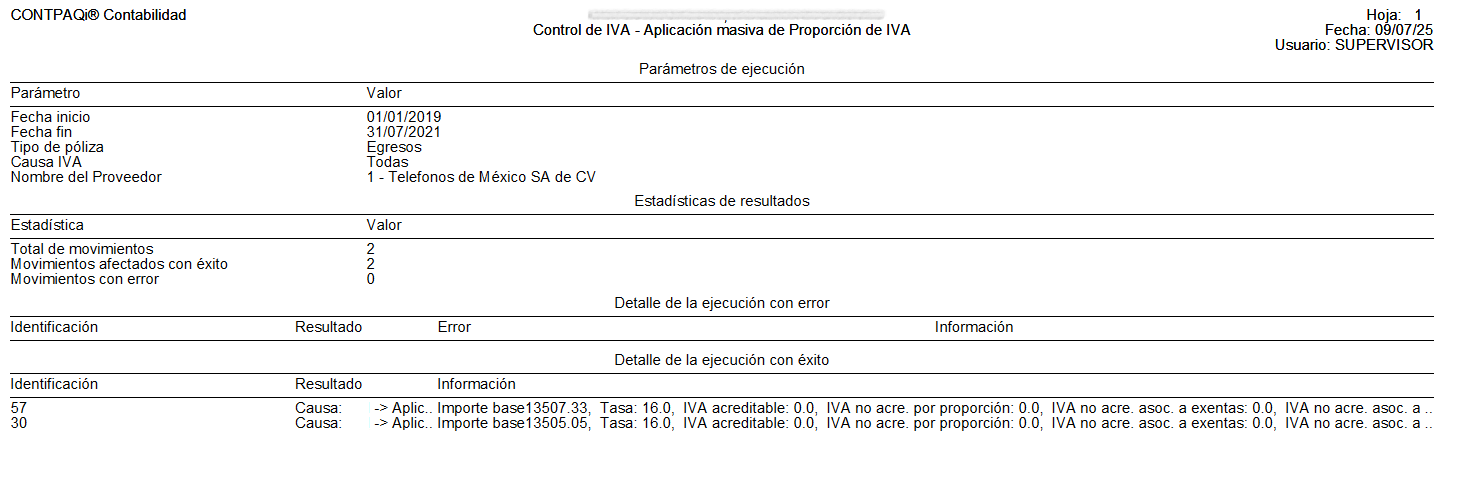 Crea una bitácora detallada con: Parámetros de selección, Parámetros de cambio, Movimientos ajustados, incluyendo: Datos de póliza, Importe base, Tasa, % de proporción, IVA acreditable e IVA no acreditable (por proporción, por actividades exentas o no objeto).