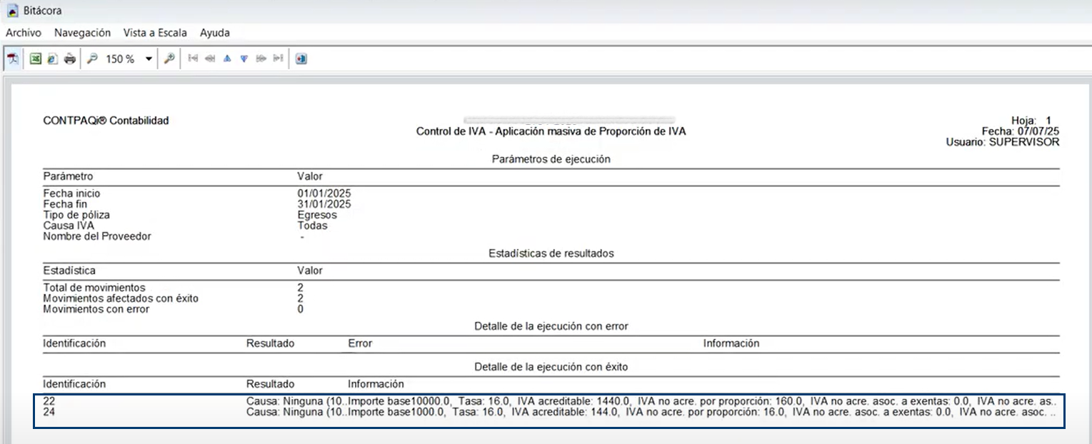 Si el porcentaje capturado, corresponde a la causa seleccionada, se efectúa el proceso y muestra una ventana con el resultado y la opción para consultar la bitácora con los detalles.