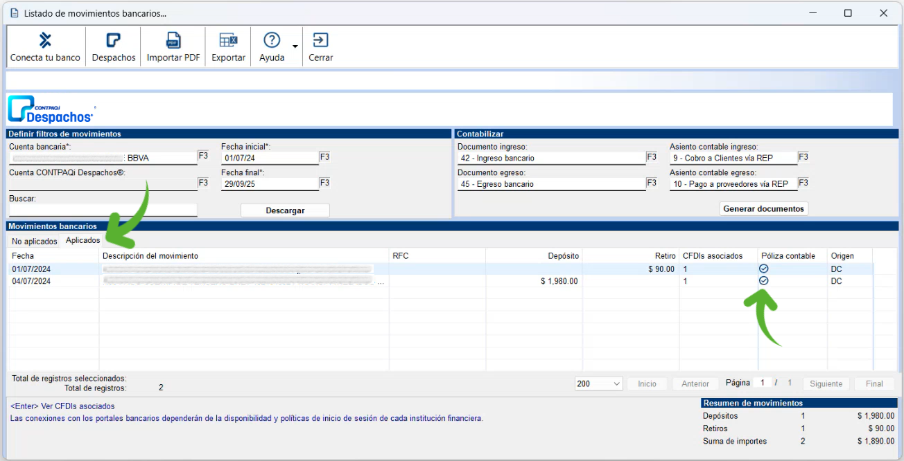 En esta pestaña podrás consultar los movimientos que fueron previamente autorizados en CONTPAQi Despachos® y que ya tienen un documento bancario y su póliza correspondiente, así como el origen del movimiento bancario. Las siglas "DC", indican que su origen es CONTPAQi Despachos®.