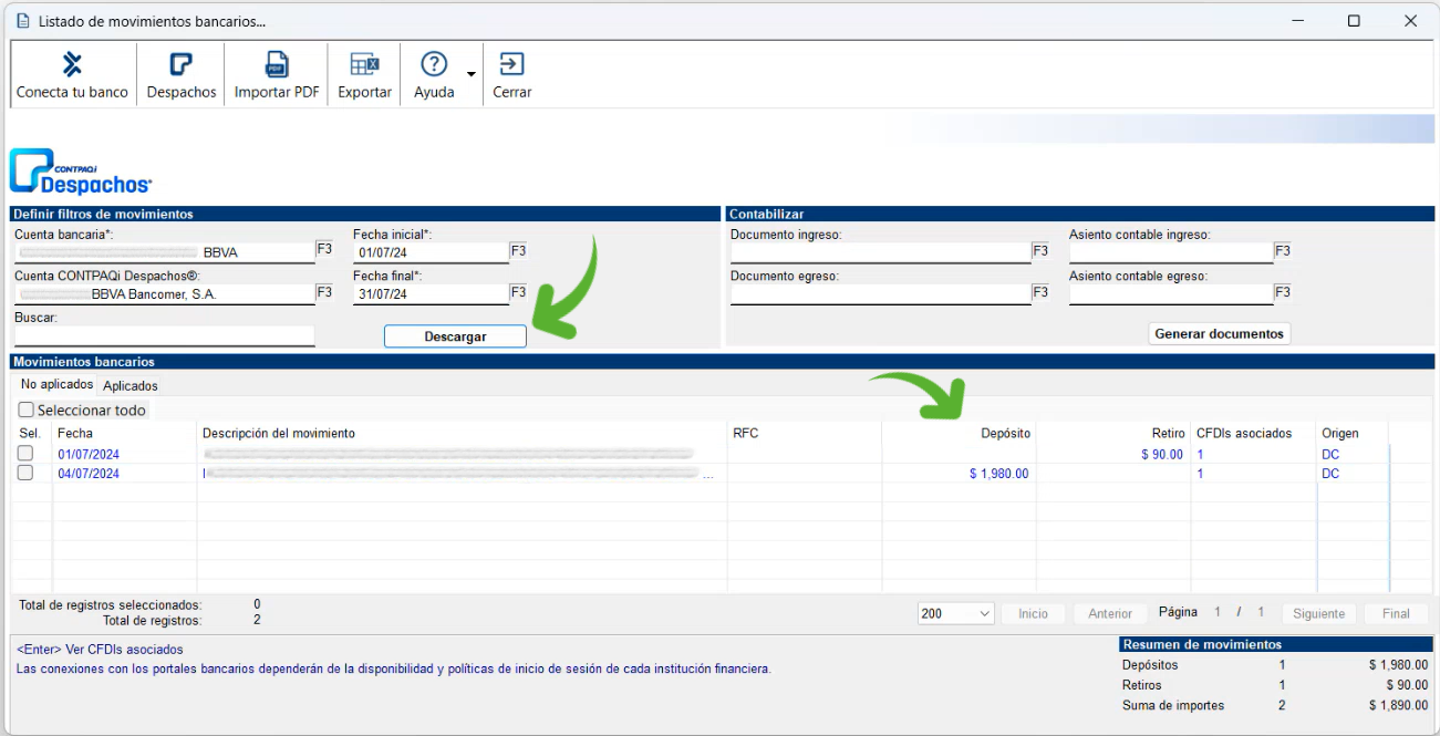 Enseguida haz clic en el botón "Descargar" para desplegar los movimientos autorizados en CONTPAQi Despachos® que corresponden a los filtros seleccionados y consúltalos en la sección de "Movimientos bancarios".