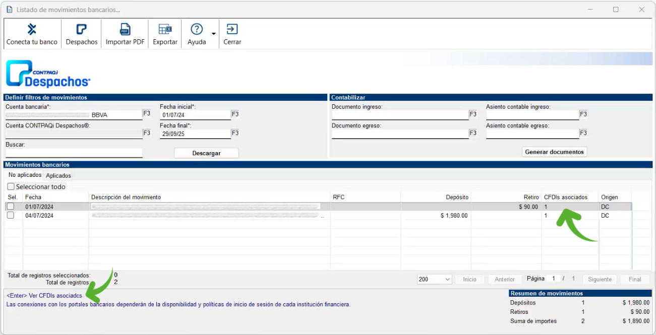 En la columna "CFDIs asociados", se indica la cantidad de comprobantes asociados al movimiento y enviados a CONTPAQi Bancos®. Si lo deseas, puedes consultarlos presionando la tecla "Enter" sobre el registro deseado.