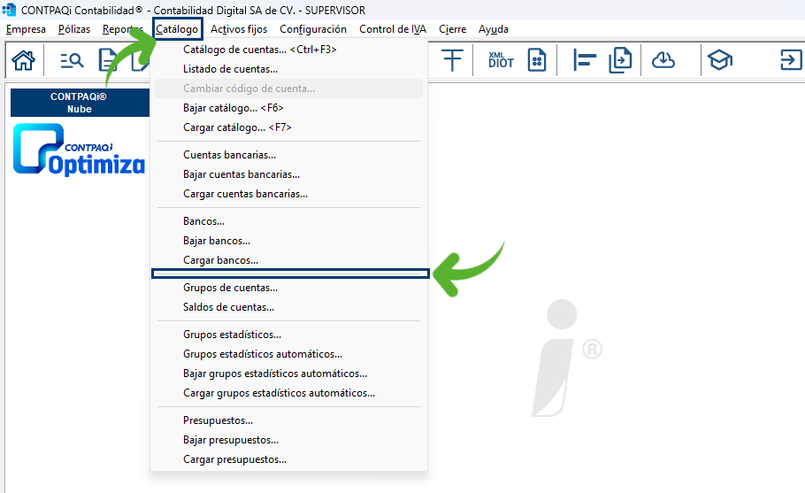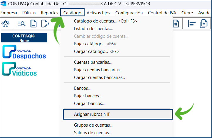 A partir de esta versión de CONTPAQi Contabilidad®, se eliminó la opción "Asignar rubros NIF", del menú Catálogos, debido a que no contaba con su funcionalidad correspondiente. Dicha opción se encontraba entre las opciones "Cargar bancos" y "Grupos de cuentas".