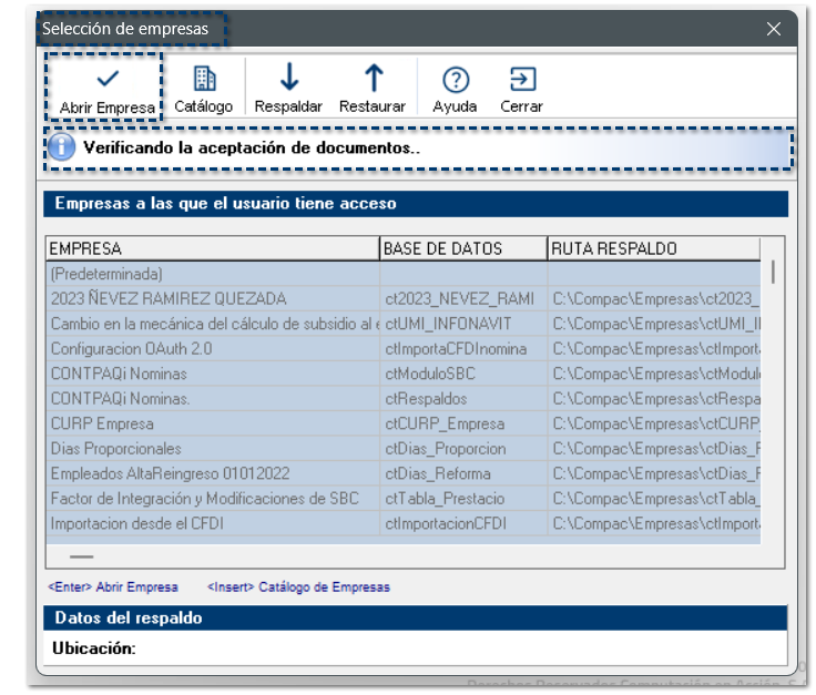 Estos documentos se mostrarán al abrir la empresa, es decir, al seleccionarla y hacer clic en el botón Abrir Empresa o hacer doble clic sobre la empresa seleccionada, se mostrará el mensaje "Verificando la aceptación de documentos.."