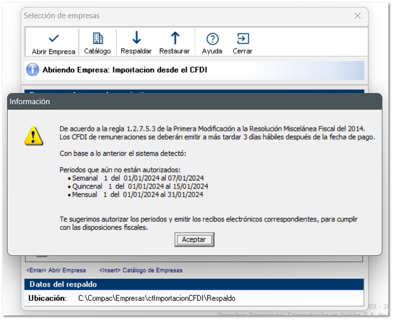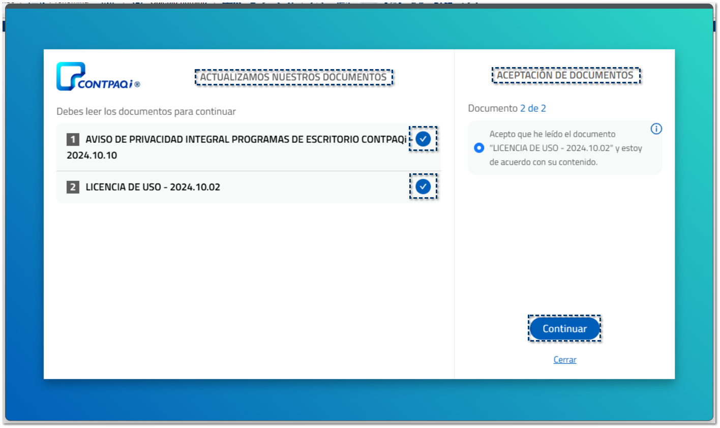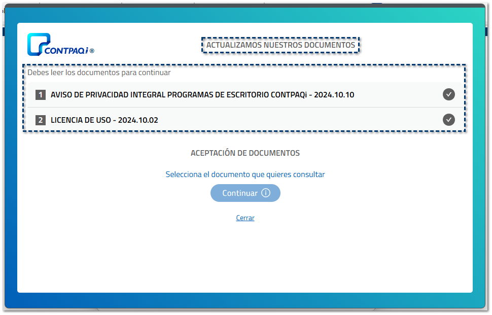 A partir de esta versión, al abrir tus empresas de CONTPAQi Nóminas® podrás aceptar el nuevo aviso de privacidad y licencia de uso de los aplicativos CONTPAQi®.