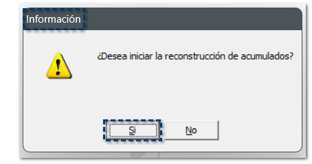 Al finalizar el proceso, se mostrará un mensaje que te sugiere ejecutar la utilería Reconstrucción de acumulados, haz clic en el botón Si para continuar.