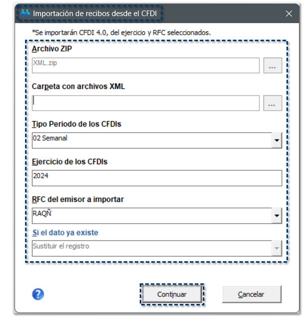 Una vez que has especificado la información necesaria para importar los CFDI de nómina, haz clic en el botón Continuar, para iniciar el proceso de importación: