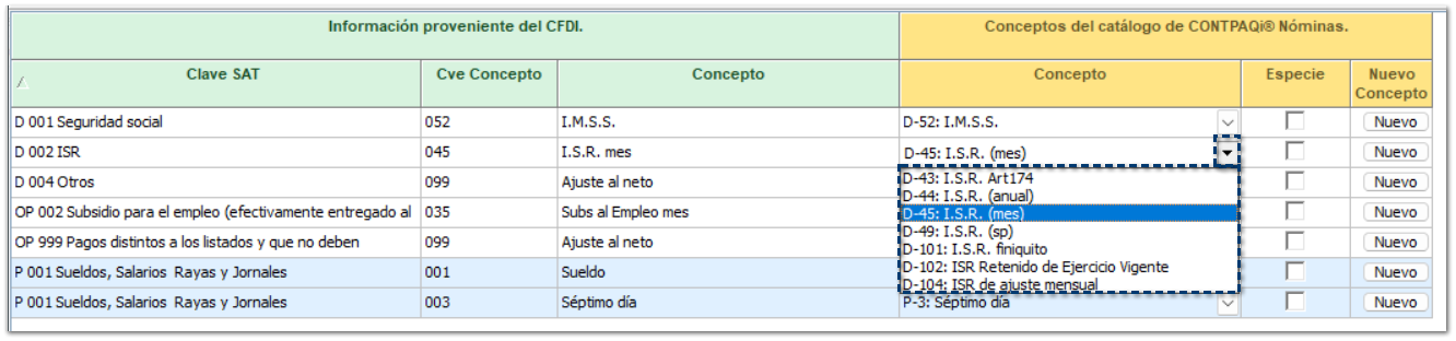 La relación se hace mediante la CLAVE SAT de los conceptos. Recuerda que encontrarás conceptos de tipo Percepción, Otros Pagos y Deducciones, con su correspondiente clave SAT.
