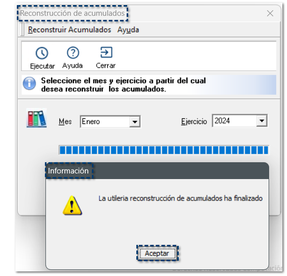 Al finalizar la reconstrucción de acumulados, haz clic en Aceptar.