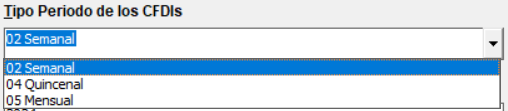 Se mostrará el listado de los tipos de periodos que estén dados de alta en tu empresa; por omisión, se mostrará la opción 02 Semanal.
