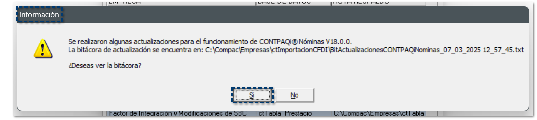 Después de instalar la versión 18.0.1 de CONTPAQi Nóminas®, al ingresar a las empresas se mostrará la siguiente ventana en la cual se indica que se han realizado actualizaciones para el funcionamiento la versión.