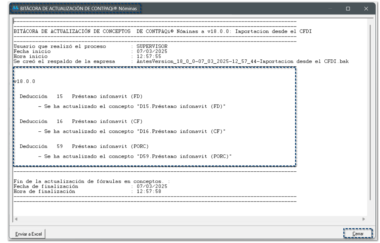 Al consultar la BITÁCORA DE ACTUALIZACIÓN DE CONTPAQi Nóminas®, visualizarás el desglose de los conceptos de Préstamo infonavit que fueron actualizados: