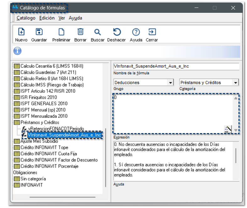 Considera que si la fórmula VInfonavit_SuspendeAmort_Aus_e_Inc tiene valor 0, no se descontarán las ausencias e incapacidades de los Días de Infonavit.