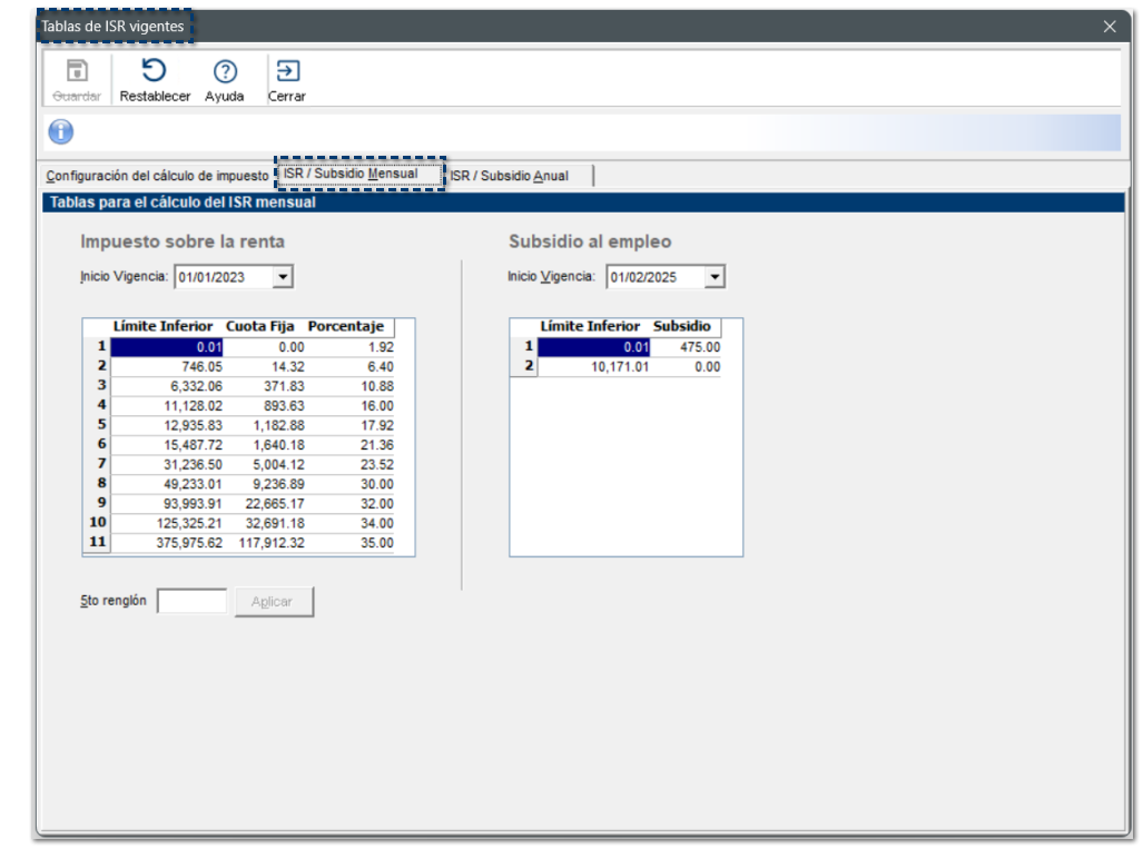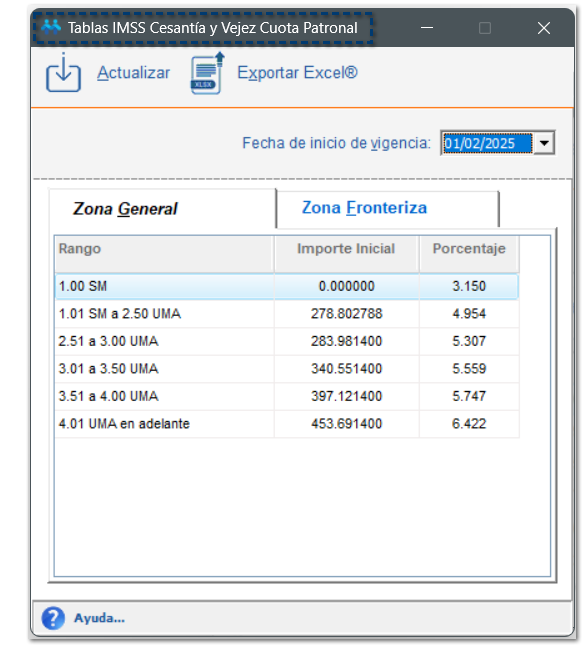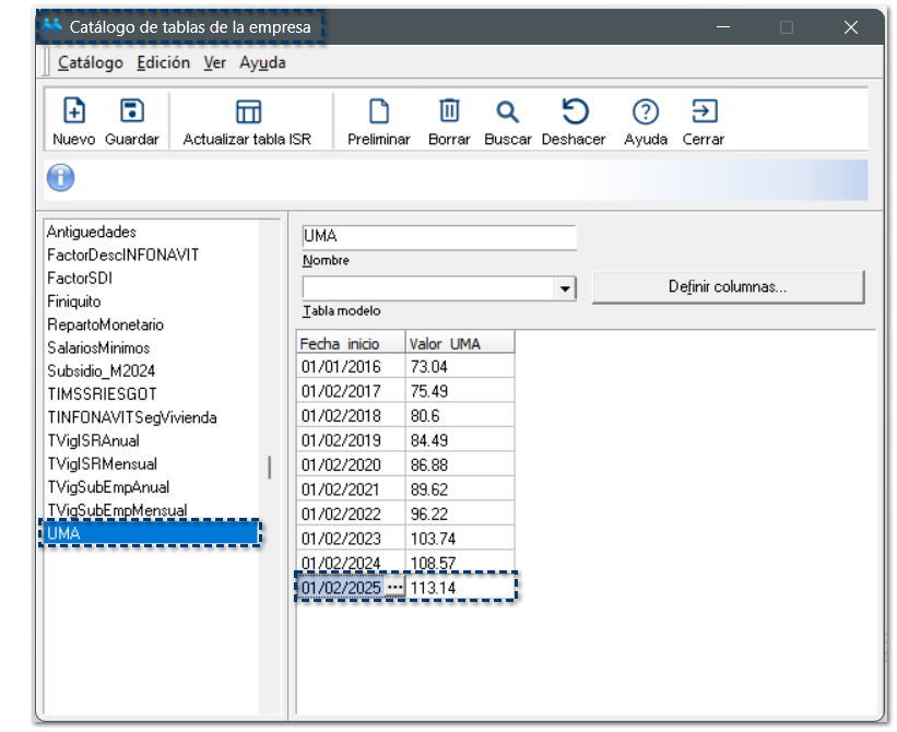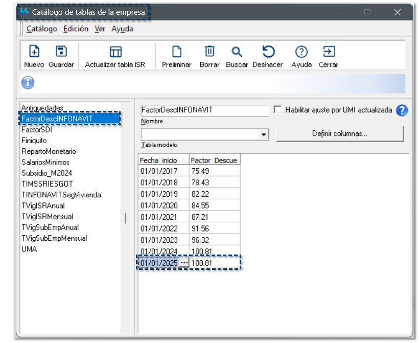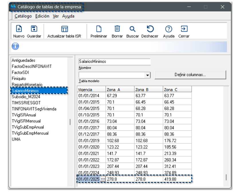 Al crear nuevas empresas, visualizarás que las siguientes tablas, continene los valores actualizados correspondientes al año 2025: