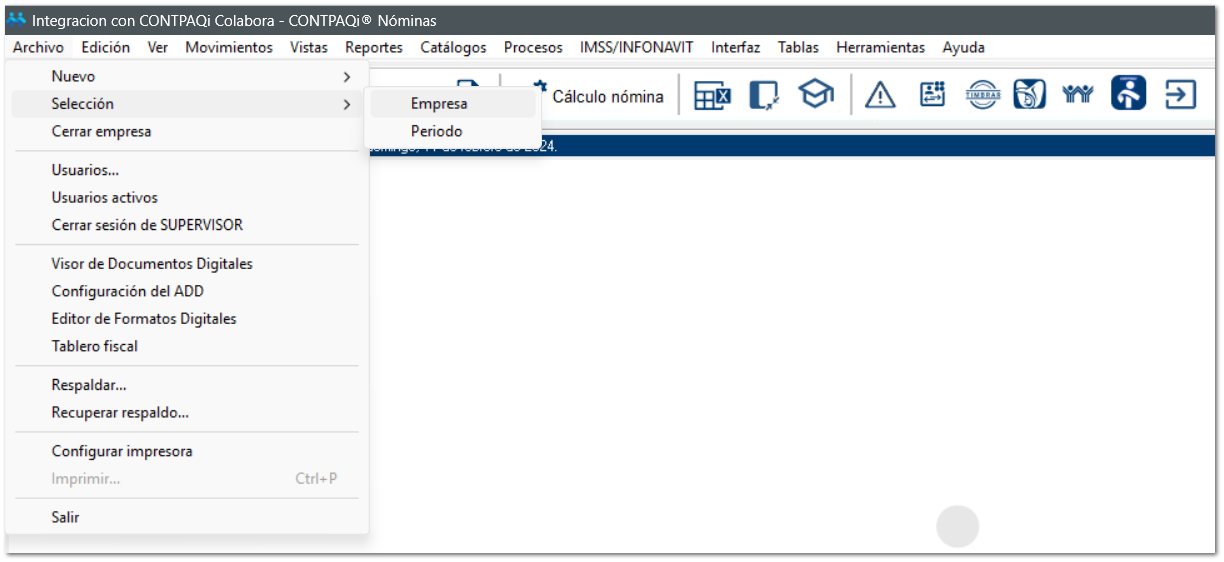 Con esta mejora técnica en el sistema, la opción Archivo\Selección\Empresa, abrirá el menú de la selección de empresas, y Archivo\Selección\Periodo abrirá el menú o la ventana de selección de periodos.