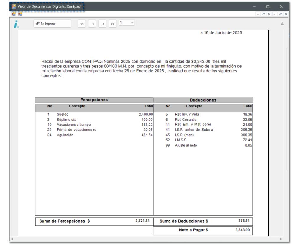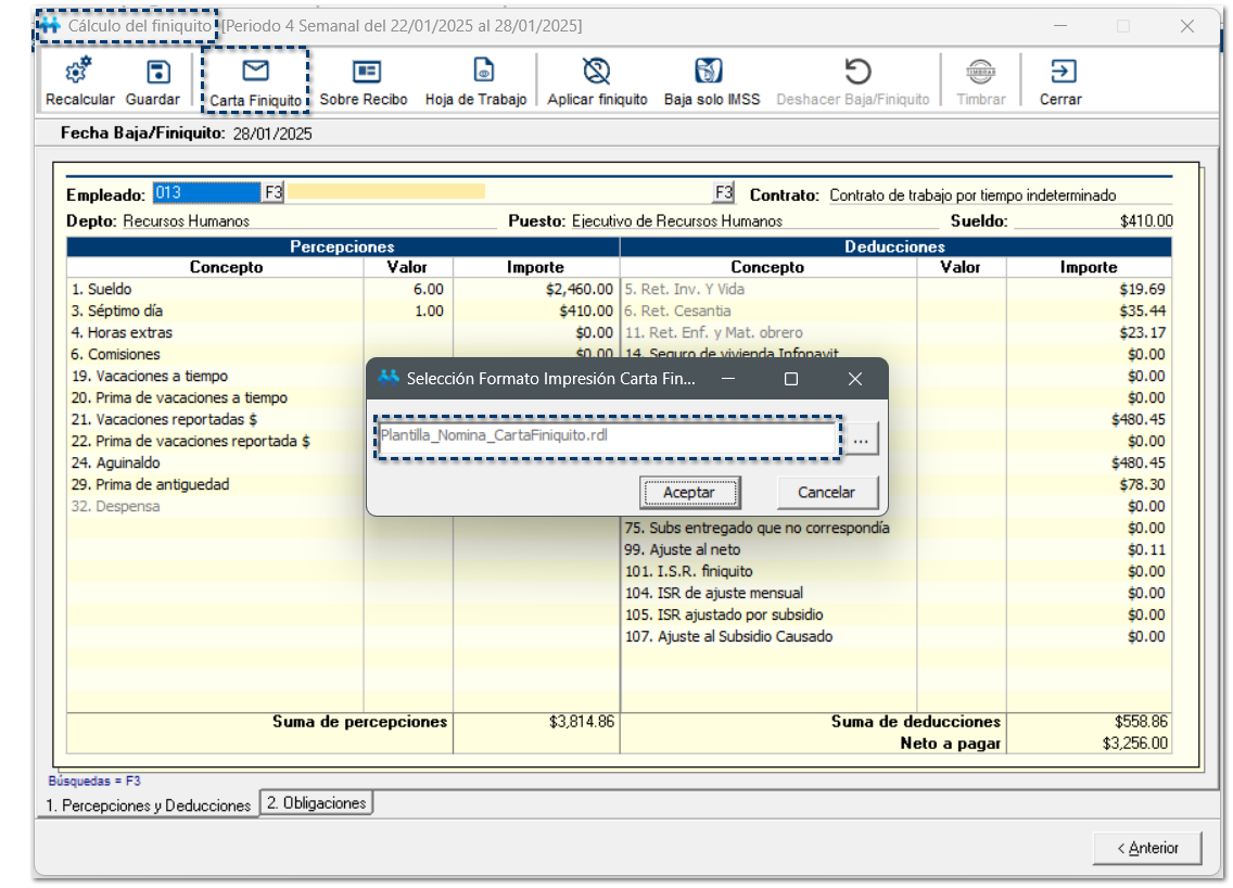 Al consultar la Carta Finiquito, desde el Cálculo del finiquito, por omisión, se mostrará el nuevo formato de carta finiquito Plantilla_Nomina_CartaFiniquito_CT.rdl