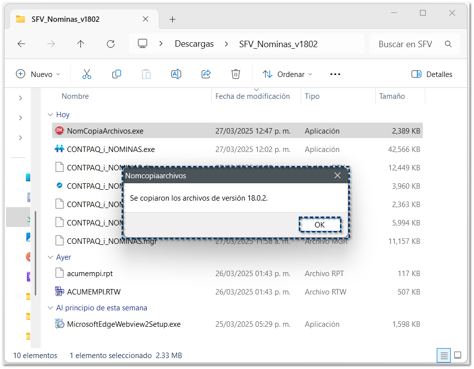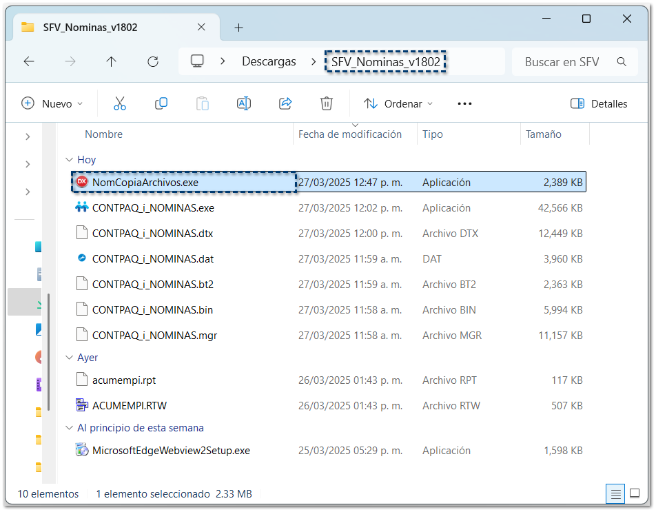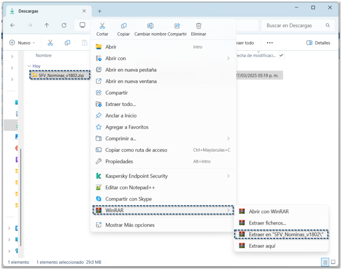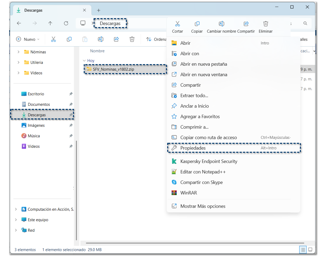 Selecciona la carpeta SFV_Nominas_v1802.zip y haz clic derecho, selecciona la opción Propiedades.