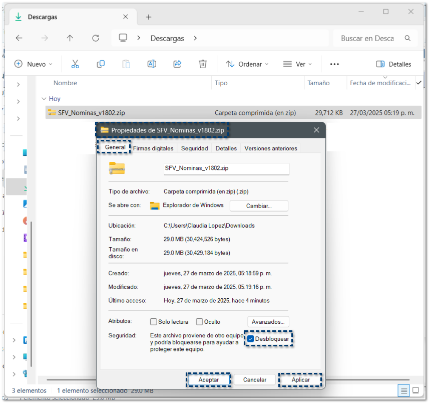 En la ventana de Propiedades, habilita la opción Desbloquear dentro de la sección Seguridad, en la pestaña General.