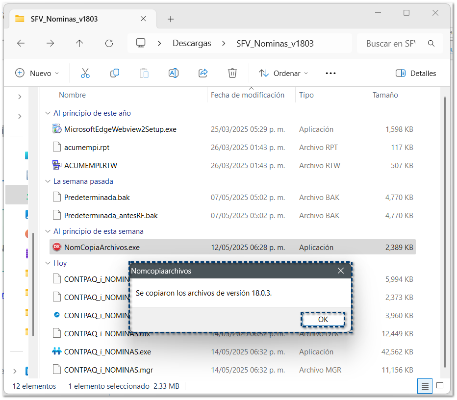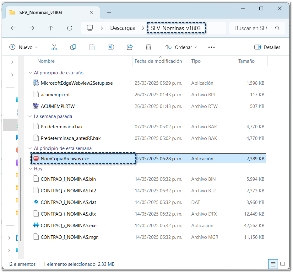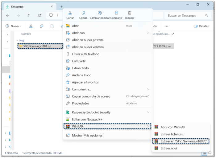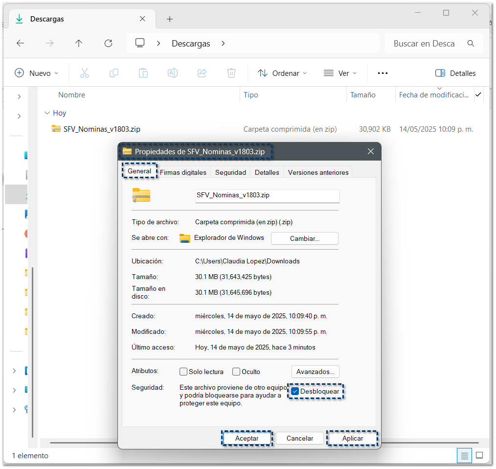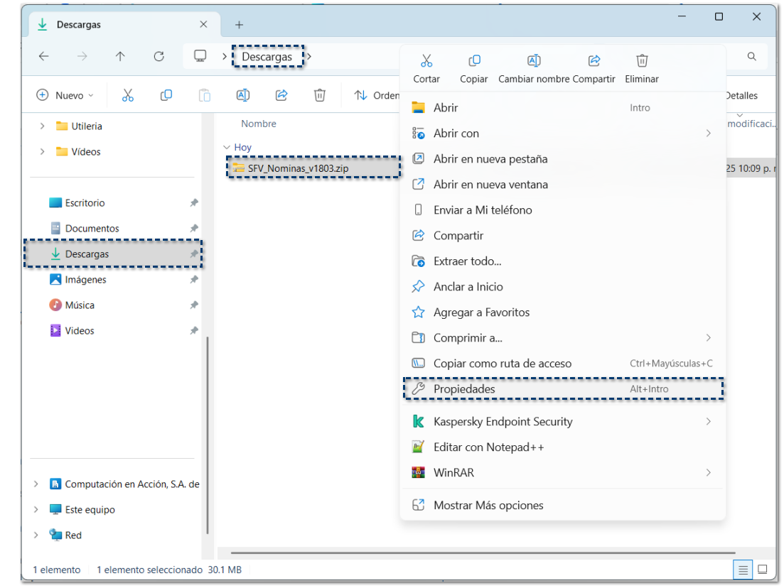 Selecciona la carpeta SFV_Nominas_v1803.zip y haz clic derecho, selecciona la opción Propiedades.