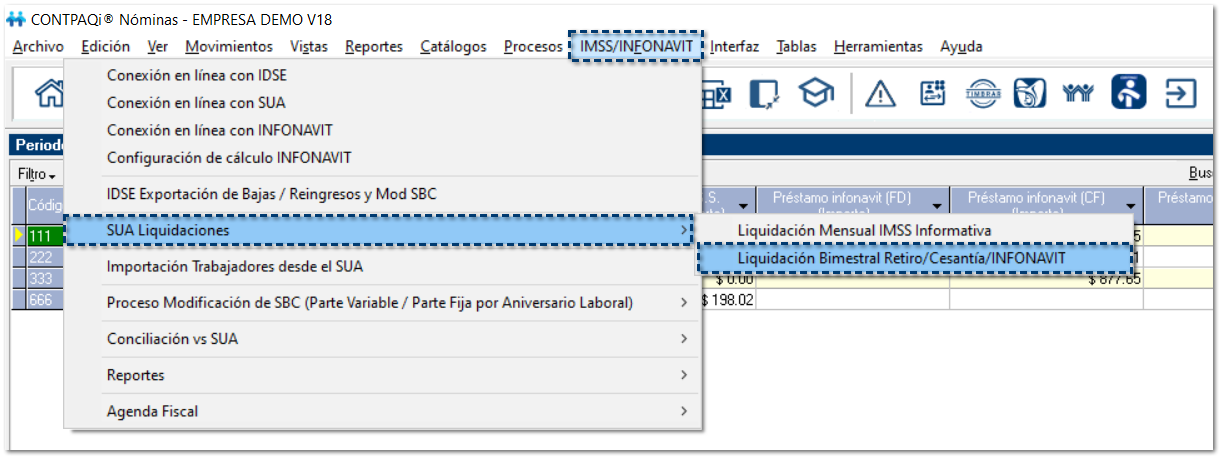 Al ejecutar el reporte Liquidación Bimestral Retiro/Cesantía/INFONAVIT, que se encuentra en el menú IMSS/INFONAVIT - SUA Liquidaciones.