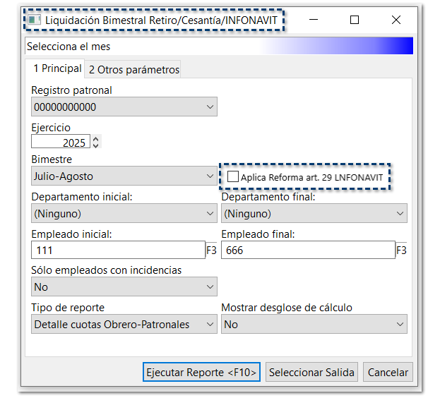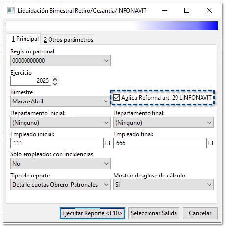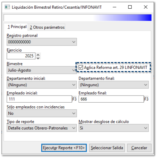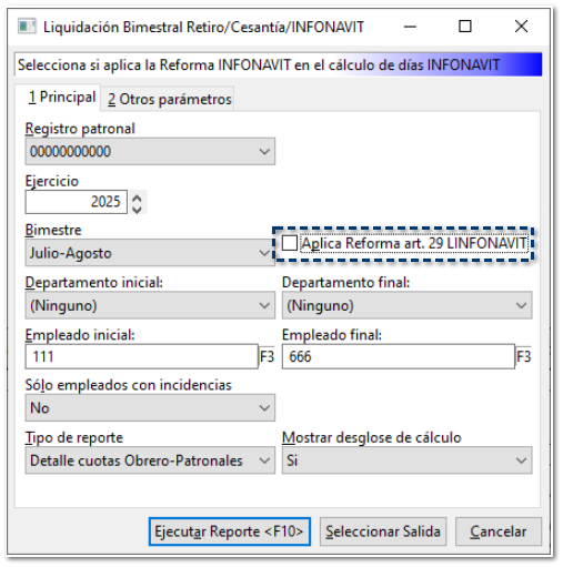 En la ventana de parámetros, se agrega un check que indica si se ejecuta aplicando Reforma INFONAVIT artículo 29.