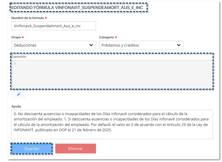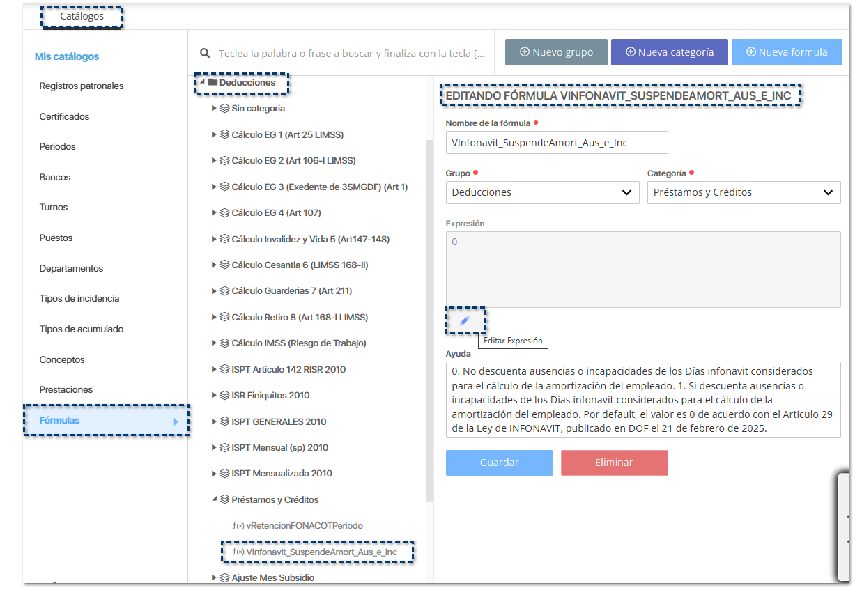 Localiza la fórmula VInfonavit_SuspendeAmort_Aus_e_Inc, en la categoría Deducciones y grupo Préstamos y Créditos.