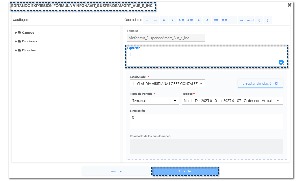 En la ventana EDITANDO EXPRESIÓN FÓRMULA, cambia el valor 0 a valor 1 en el campo Expresión.