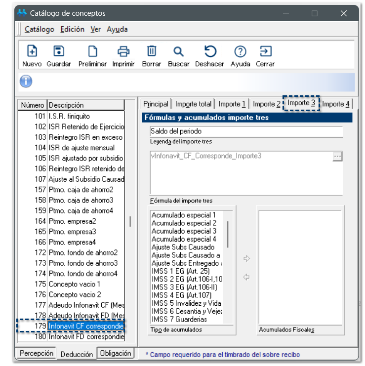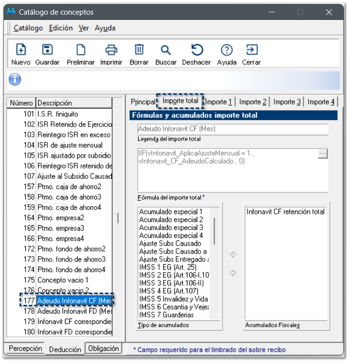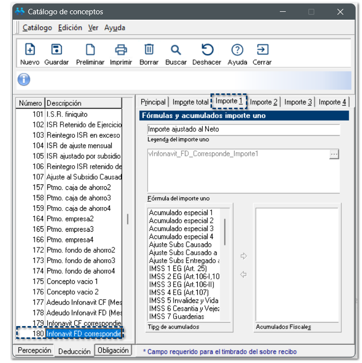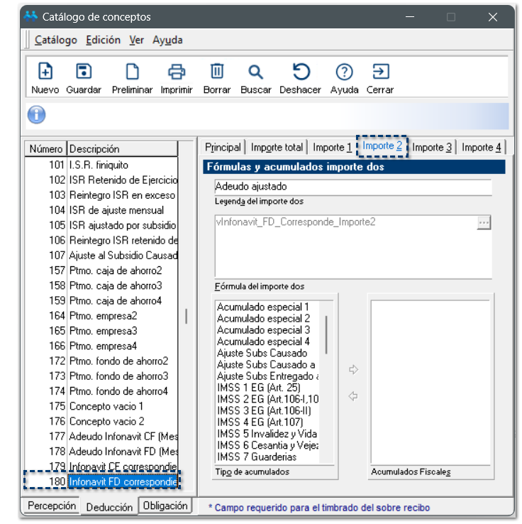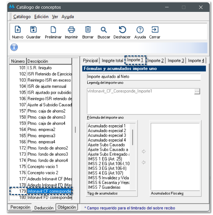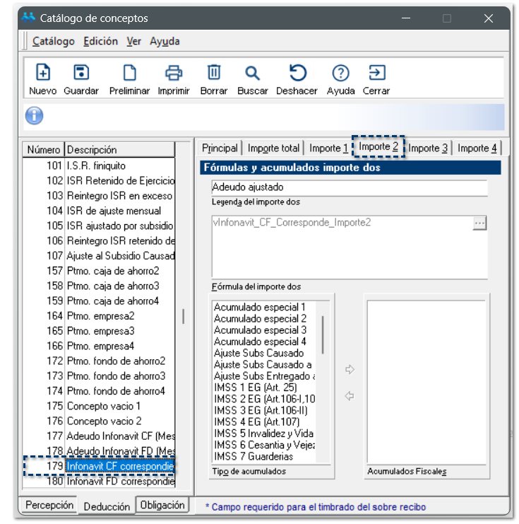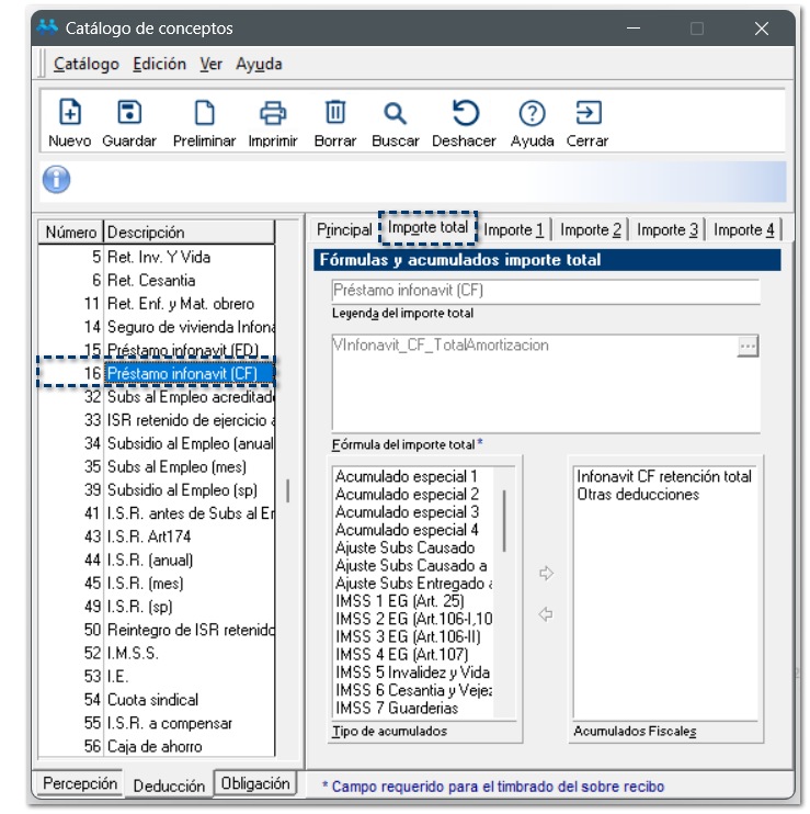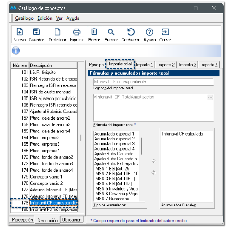 Se incluyen nuevos conceptos y acumulados que se calcule correctamente la amorización del crédito INFONAVIT, incluso en periodos de ausencia o incapacidad, considerando los límites legales y conforme al criterio normativo.