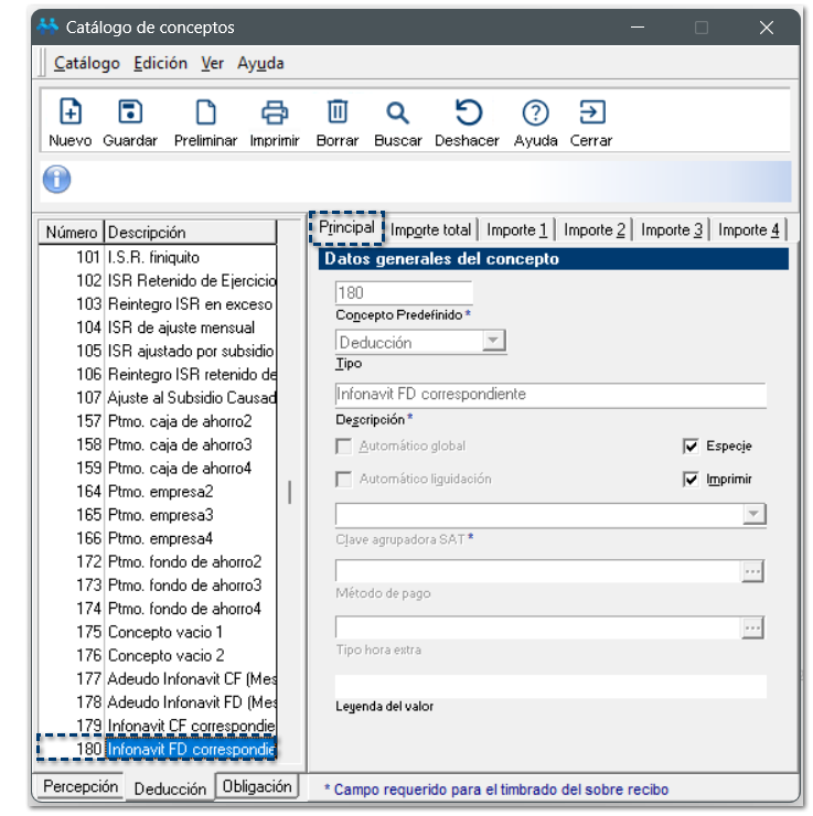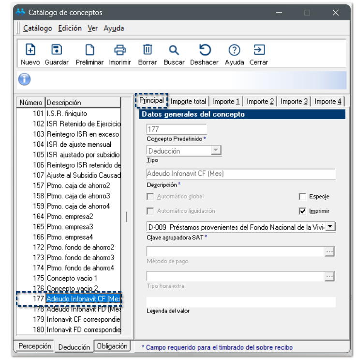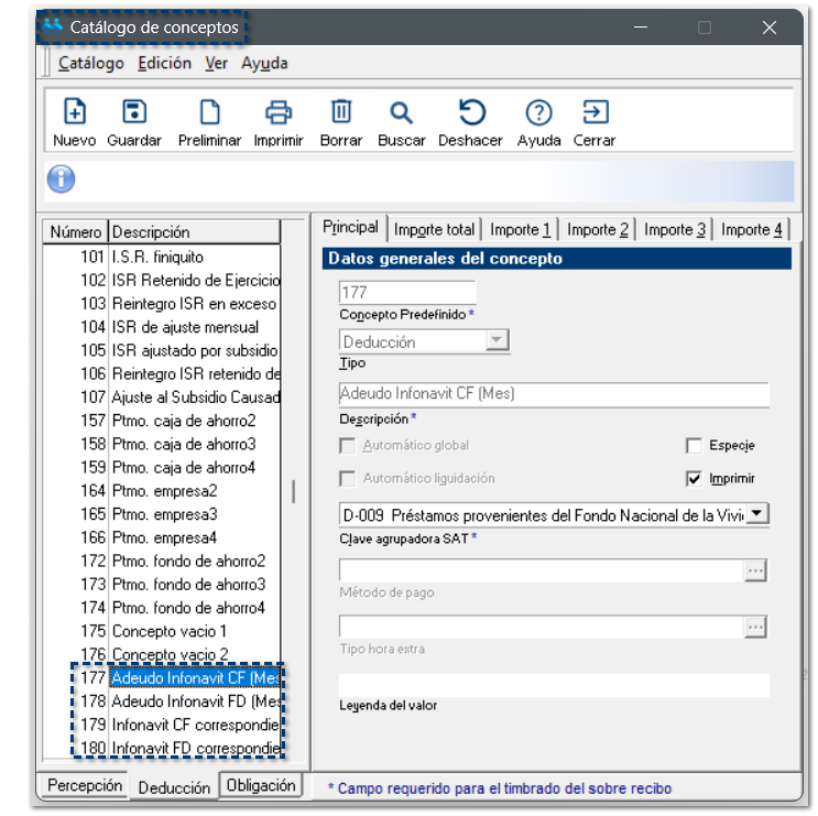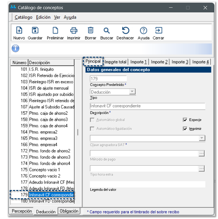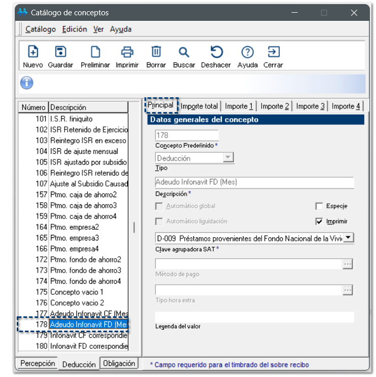 Conceptos.Al ingresar al menú Catálogos, y seleccionar el submenú Conceptos, dentro del listado de conceptos de tipo Deducción, se agregan 4 conceptos nuevos de Infonavit: