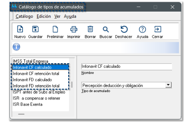 Acumulados.Al ingresar al menú Catálogos, y seleccionar el submenú Tipo de acumulado, dentro del listado de tipos de acumulado, se agregan 4 acumulados para el control de Amortización Infonavit: