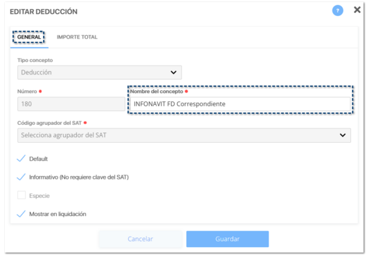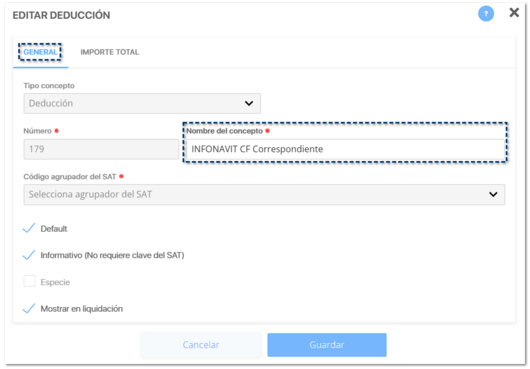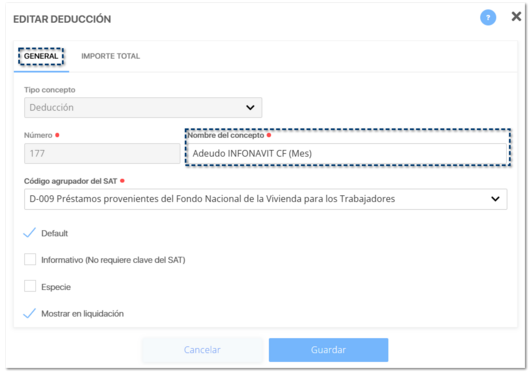 Los conceptos INFONAVIT CF correspondiente e INFONAVIT FD correspondiente, deben ser en especie y no editables por el usuario.