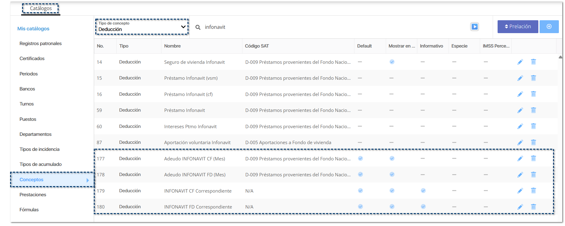 ![]() Dentro del listado de conceptos de tipo Deducción, se agregan 4 conceptos nuevos de Infonavit: